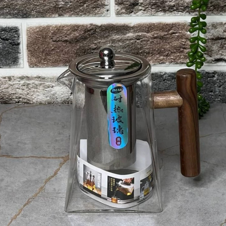 قوری پیرکس شعله مستقیم مربعی صافی دار دسته چوبی 950 میل