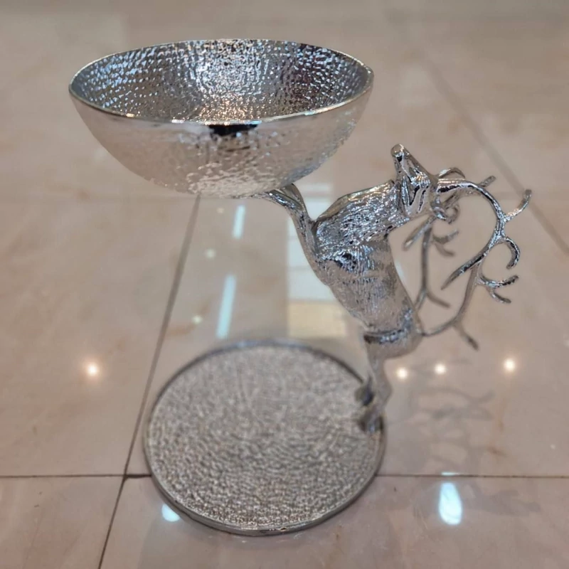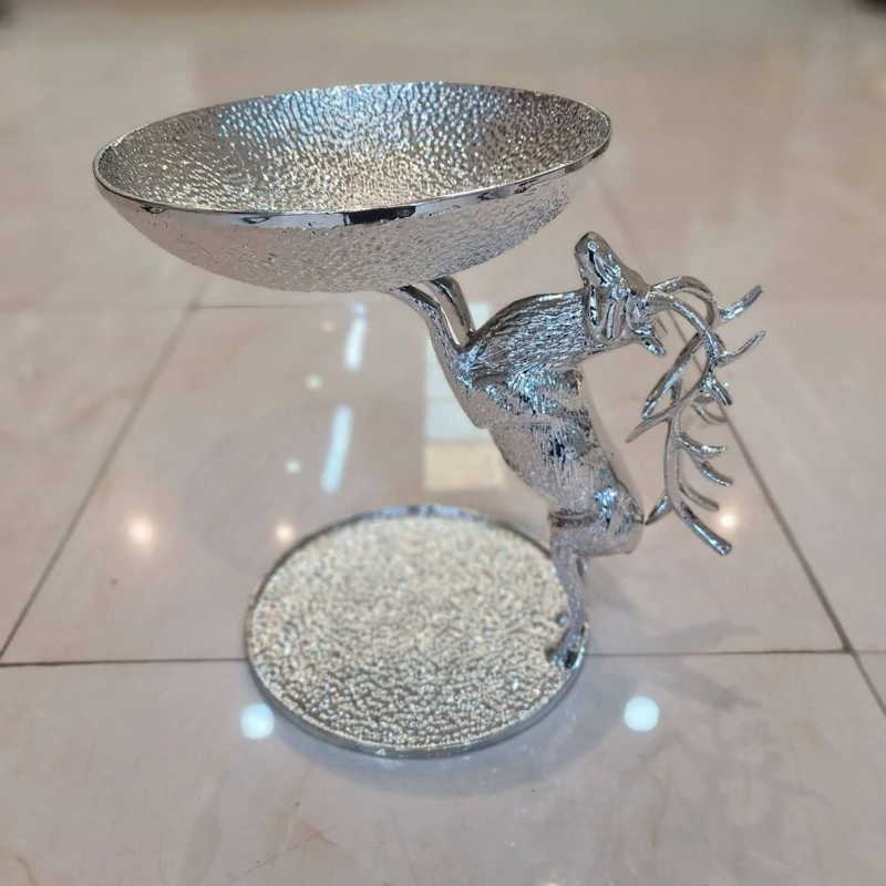 ست پذیرایی گوزن پرشی چکشی طلایی و سیلور شامل: میوه خوری شیرینی خوری آجیل خوری آبکاری سوپر براق با ضمانت جنس آلومینیوم درجه یک رنگ ثابت 4سال ضمانت