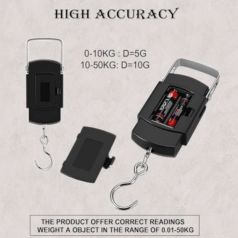 ترازوی آویز دیجیتال سبک و همراه برای توزین مطمئن تا 50 کیلوگرم؛ مناسب برای کاربری صنعتی سبک، فروشگاهها، انبارها، مسافرت و استفاده خانگی که نیاز به اندازهگیری اجسام سنگین بهصورت آویز دارد.
