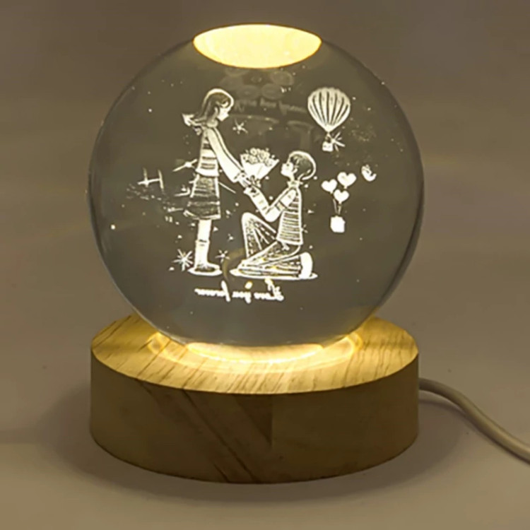 این چراغ خواب کریستالی به صورت سه بعدی و در طرح دختر و پسر عاشق تولید شده که باعث جذابیت بیشتر اتاق خواب شما می شود. جنس این گوی شیشه ای از کریستال فشرده می باشد و همچنین دارای یک پایه چوبی و کابل برق USB می باشد. این چراغ خواب زیبا در دو رنگ ثابت و متغیر چند رنگ قابل دسترس است.