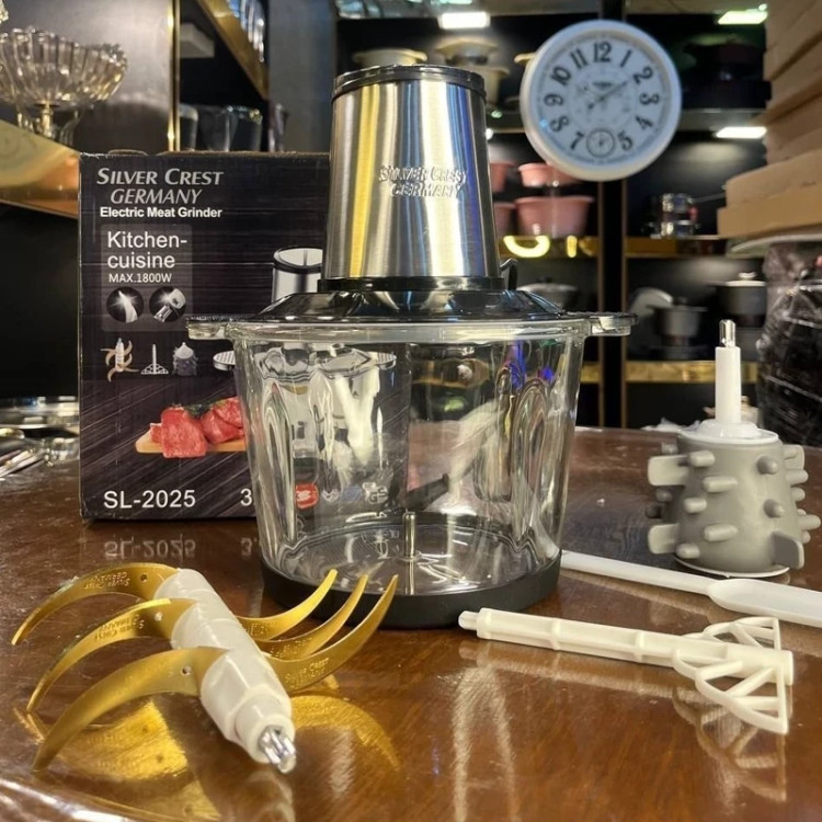 برند سیلور کرست یکی از معروف ترین تولید کنندگان لوازم خانگی است که خردکن های بسیار حرفه ای را تولید و روانه بازار نموده است . خردکن سیلور کرست جزو پرفروش ترین و پرطرفدارترین محصولات در بازار می باشد . یکی از محصولات جدید این برند خردکن سیلور کرست مدل SL-2025 می باشد که با توجه به کارایی فوق العاده بسیار کاربردی است . متاسفانه نمونه تقلبی این محصول در بازار بسیار است و از نظر ظاهری شباهت زیادی به نمونه اصلی دارد. موتور و تیغه های این دستگاه به گونه ای طراحی شده است که توانایی خرد کردن انواع مواد غذایی از جمله گوشت ، مرغ ، سبزیجات ، سیب زمینی ، هویج ، صیفی جات و غیره را دارد . یک دستیار تمام عیار در آشپزخانه شما می باشد و می توانید در کمترین زمان و به آسانی هر آنچه را که لازم دارید خرد کنید . یک مخزن پیرکس برای این محصول تعبیه شده است به همراه شش تیغه تیتانیومی با کیفیت و سری سیر پوست کن که این محصول را از دیگر خردکن های بازار متمایز می نماید . یکی از مهم ترین ویژگی این محصول موتور پر قدرت 1800 واتی آن است . حجم مخزن این دستگاه 3.8 لیتر می باشد و از جنس پیرکس است . یک تیغه همزن برای این خردکن طراحی شده است که می توانید با استفاده از آن به راحتی مایه کیک و انواع سس ها را تهیه نمایید . همچنین دارای یک تیغه سیر پوست کن می باشد که می توانید مقدار زیادی سیر را بدون دردسر پاک کنید .